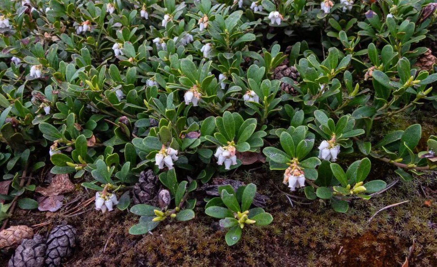 Толокнянка - небольшой вечнозеленый кустарник семейства Вересковых, имеет распростертые ветви и мелкие, кожистые листья. Листья блестящие, снизу белые, с заметными сетчатыми прожилками. Стебли лежащие, стелются на поверхности грунта, длинной до метра. Разветвленные стебли тянутся с восходящими цветоносными веточками. Внешне толокнянка схожа с брусникой, хотя брусника не стелется и не образует дернины, а на листьях отсутствуют коричневые точечки.